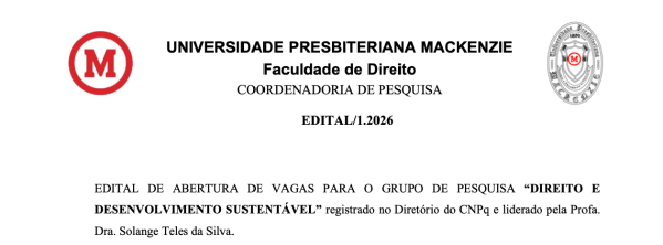 A Coordenadoria de Pesquisa divulgou ontem, dia 9 de março de 2026, o Edital/1.2026 de Abertura de Vagas para o Grupo de Pesquisa "Direito e Desenvolvimento Sustentável", o qual conta com a liderança da Profa. Dra. Solange Teles da Silva. Sobre as questões abordadas nas pesquisas tem-se "o desenvolvimento sustentável, a transição ecológica, a relação... Continuar Lendo →