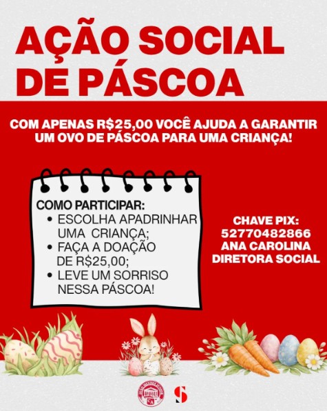 O CAJMJr iniciou mais uma campanha!Nesta Páscoa, você pode transformar solidariedade em chocolate. 🍫✨Com uma contribuição de apenas R$25,00, você ajuda a levar um ovo de Páscoa para uma criança e a tornar o dia dela mais especial. Toda doação faz diferença e ajuda a espalhar alegria! Chave Pix: 52770482866(Ana Carolina – Diretora Social) Contribua... Continuar Lendo →