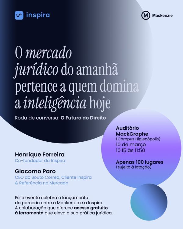 O Mackenzie e a Inspira se uniram para transformar a educação jurídica para a nova advocacia. A partir de hoje, alunos Mackenzie têm acesso GRATUITO à ferramenta de IA que já eleva a prática jurídica de mais de 200 escritórios brasileiros. A Inspira oferece tecnologia para facilitar suas pesquisas de jurisprudência, organizar teses e gerar... Continuar Lendo →