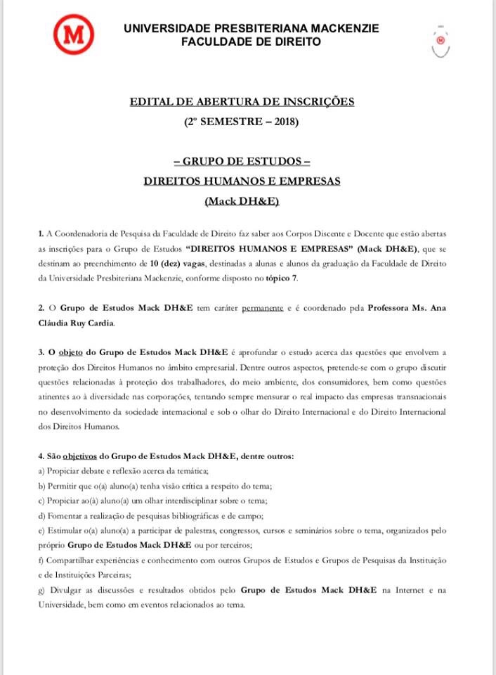O Grupo de Estudos MackDH&E, coordenado pela Professora Ms. Ana Claudia Ruy Cardia, abre inscrições para o preenchimento de 10 vagas.