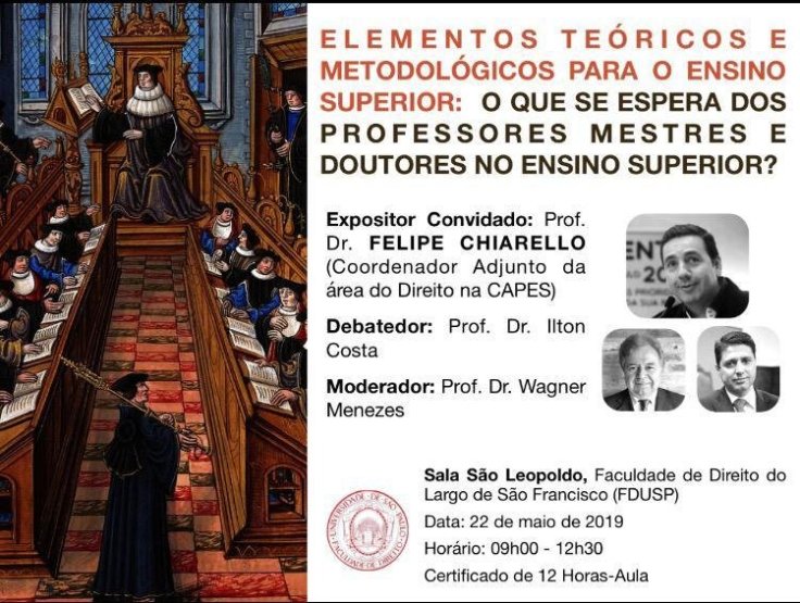 O Diretor da Faculdade de Direito da Universidade Presbiteriana Mackenzie, Prof. Dr. Felipe Chiarello, palestra próximo dia 22/05, a partir das 9h, na Faculdade de Direito da USP. O encontro debaterá “Elementos teóricos e metodológicos para o ensino superior” e contará com outros dois professores. O evento dará 12h complementares, na modalidade extensão, aos presentes.