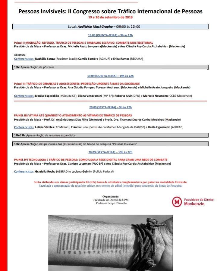 Durante a manhã e à noite, passarão pelo auditório do MackGraphe, as professoras doutoras da casa, Ana Cardia, Ana Torezan, Michelle Asato e Thamara Duarte; o membro da CCBS-Mackenzie Marcelo Neumann; a professora doutora da PUC, Clarisse Laupman e o professor doutor da Uninove, Antônio Jonas Dias Filho; membros do Ministério Público, da Polícia Federal, Réporter Brasil, ACNUR, RESAMA, Mães da Sé, 27 Million, Comissão da Mulher Advogada da OAB/SP e ASBRAD.