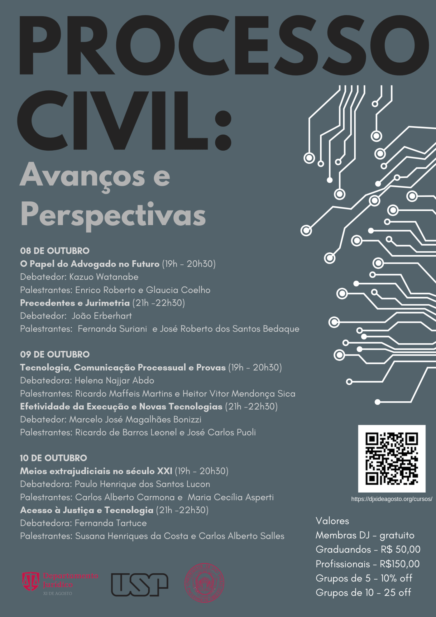 O Departamento Jurídico XI de Agosto, da Faculdade de Direito da USP, organiza seu tradicional curso anual, este ano com o tema “Processo Civil: Avanços e Perspectivas”.