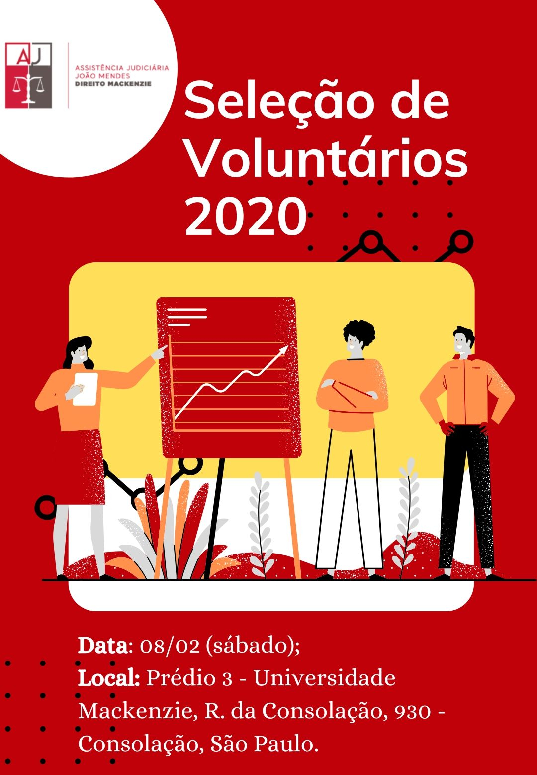 Havendo interesse em comparecer à reunião, os voluntários deverão confirmar presença na reunião de apresentação geral que ocorrerá em 08/02/2020 (sábado), às 11h, no prédio 3, centro histórico do Direito Mackenzie. Para confirmar presença no evento é necessário preencher o formulário disponível no link.