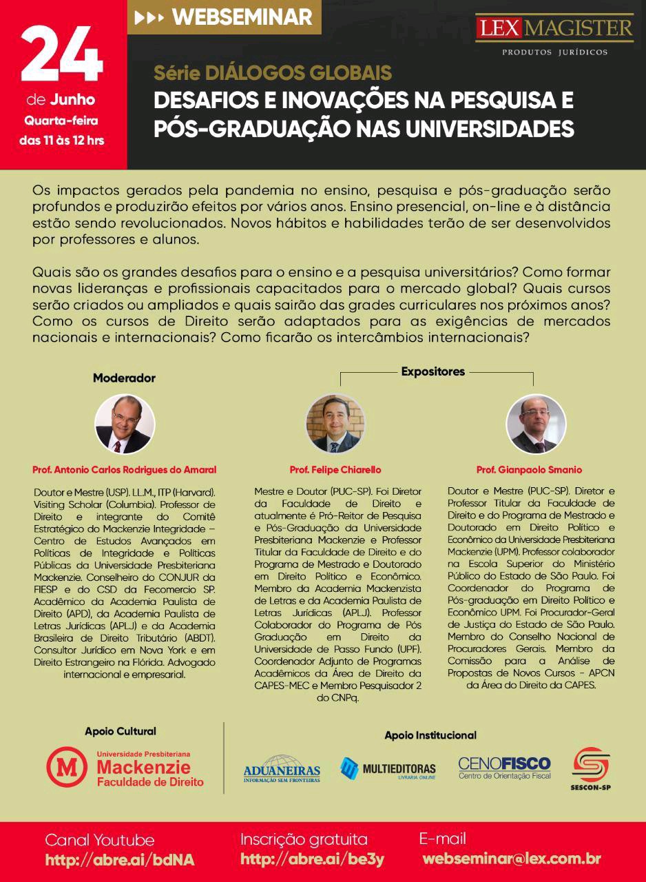 Participarão, como expositores, o professor Felipe Chiarello, que foi diretor da Faculdade de Direito da Universidade Mackenzie, e o professor Gianpaolo Smanio, que é o atual diretor de nossa faculdade, além de ser moderado por Antonio Amaral.
