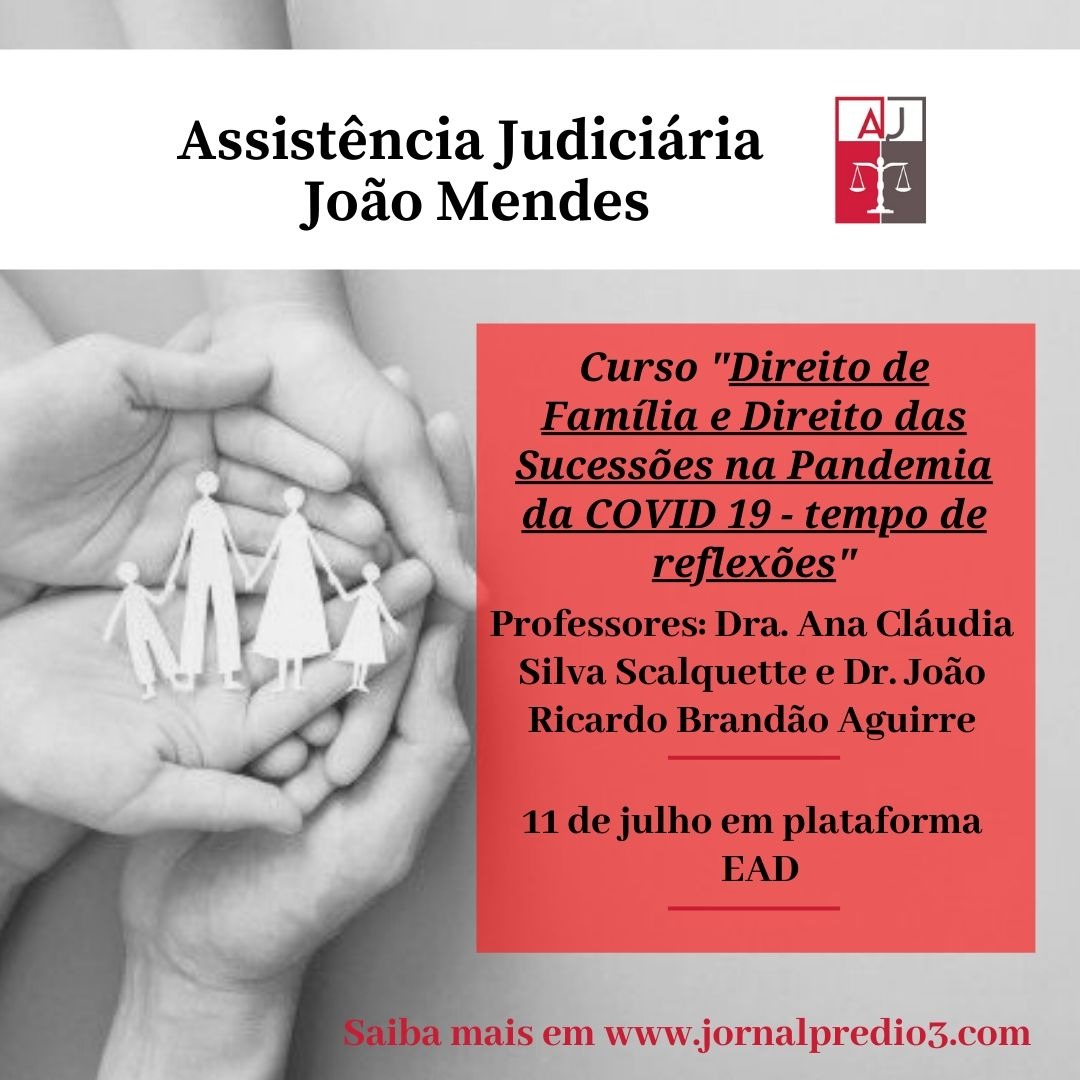 A Assistência Judiciária João Mendes (AJ), órgão de orientação jurídica gratuita à população de baixa renda, dos alunos e antigos alunos da Faculdade de Direito do Mackenzie, em parceria com o Centro Acadêmico João Mendes Jr. e a Alumni Direito Mackenzie, anuncia a realização do Curso “Direito de Família e Direito das Sucessões na Pandemia da COVID-19 – tempo de reflexões”, a ser ministrado pela Professora Ana Cláudia Silva Scalquette, Doutora em Direito Civil pela Universidade de São Paulo (USP) e Professora dos Cursos de Graduação e Pós-Graduação da Universidade Presbiteriana Mackenzie (UPM) e pelo Professor João Ricardo Brandão Aguirre, Pós-Doutor em Direito Civil na Faculdade de Direito da Universidade de São Paulo (USP) e também Professor na Universidade Presbiteriana Mackenzie.