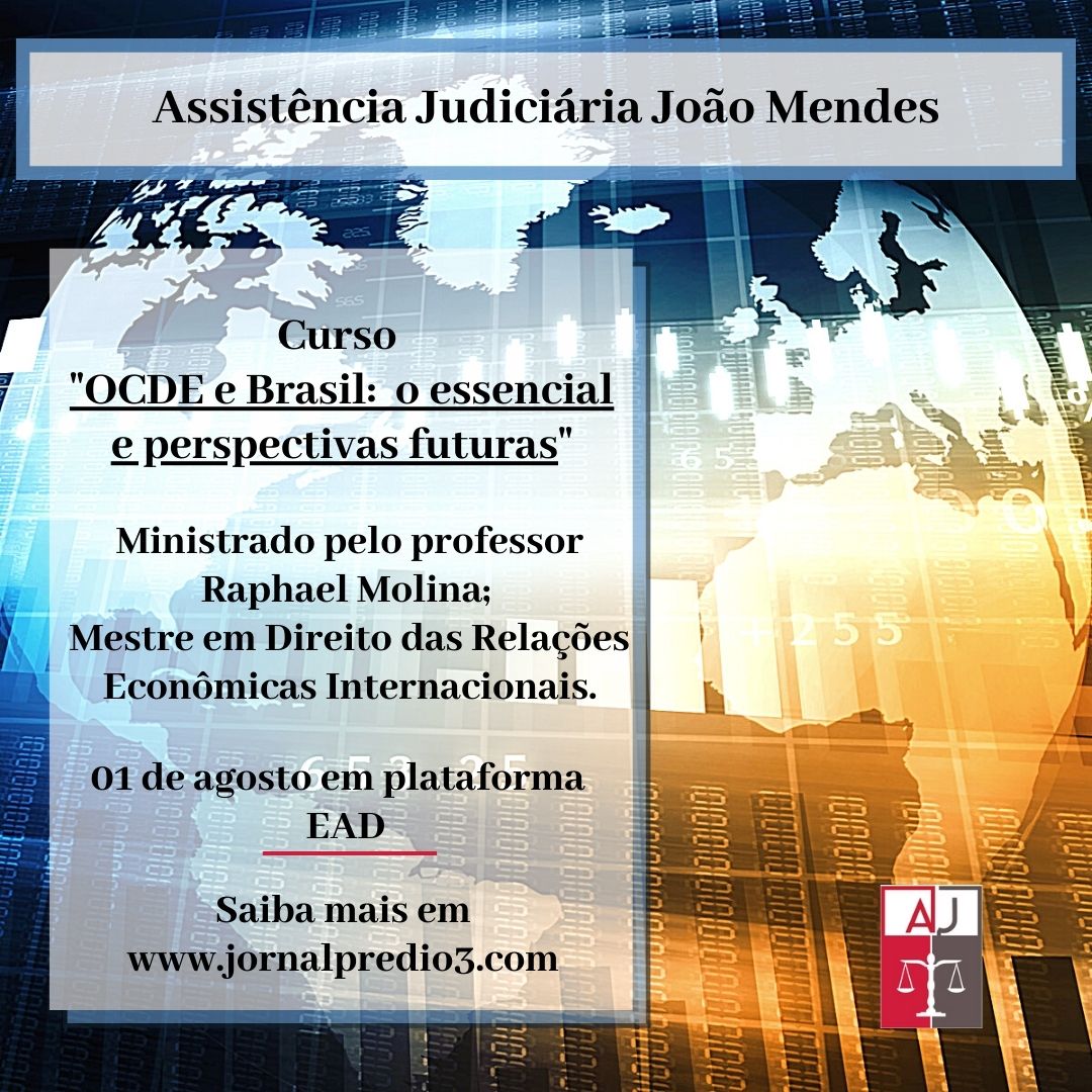 A Assistência Judiciária João Mendes (AJ), órgão de orientação jurídica gratuita à população de baixa renda, dos alunos e antigos alunos da Faculdade de Direito do Mackenzie, em parceria com o Centro Acadêmico João Mendes Jr. e a Alumni Direito Mackenzie, anuncia a realização do Curso “OCDE e Brasil: o essencial e perspectivas futuras”, a ser ministrado pelo Professor Raphael Molina, Advogado, sócio de Molina & Reis Sociedade de Advogados, mestre em Direito das Relações Econômicas Internacionais na Pontifícia Universidade Católica de São Paulo – PUC-SP, membro associado do Instituto Brasileiro de Direito Tributário (IBDT).