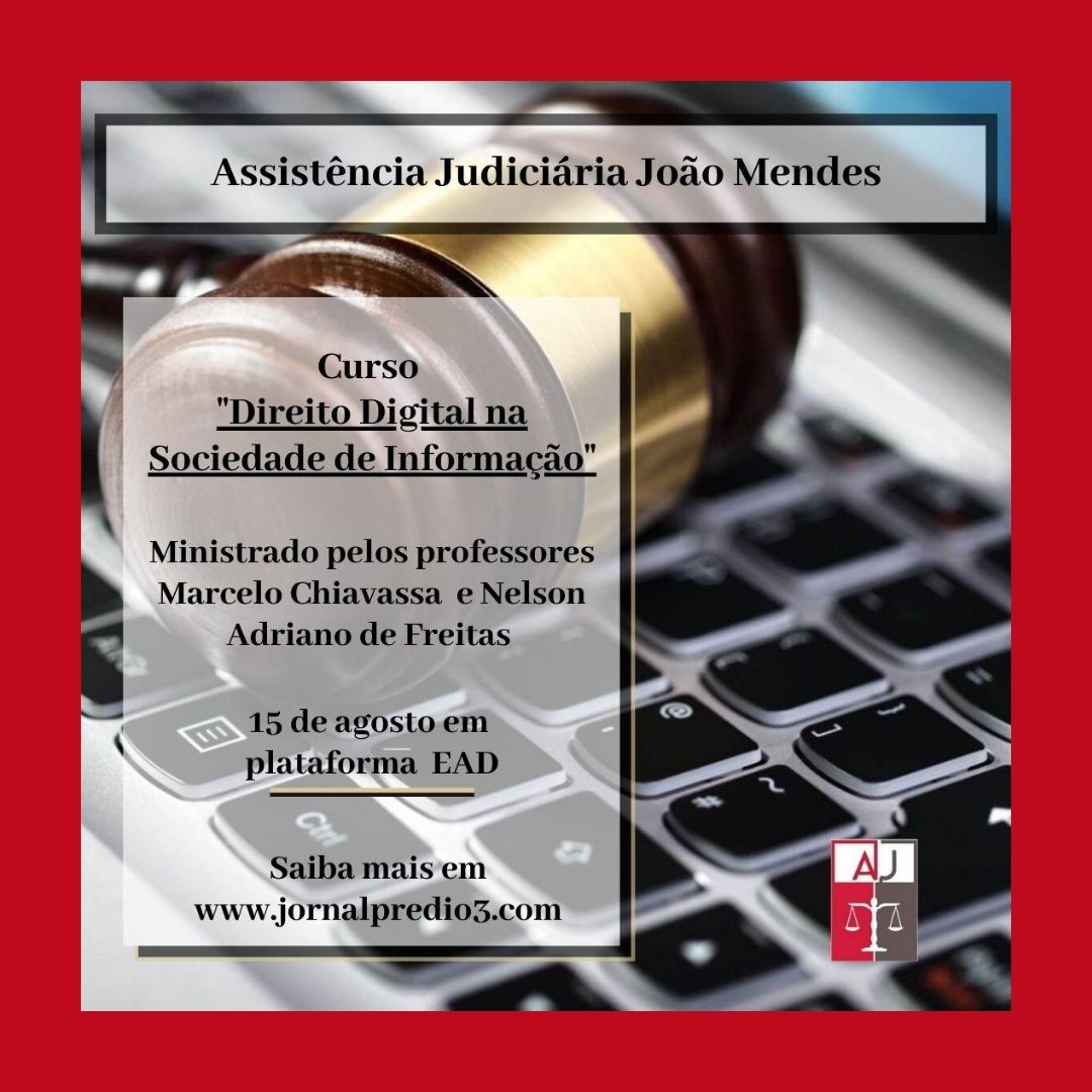 A Assistência Judiciária João Mendes (AJ), órgão de orientação jurídica gratuita à população de baixa renda, dos alunos e antigos alunos da Faculdade de Direito do Mackenzie, em parceria com a FACAMP – Faculdades de Campinas, anuncia a realização do Curso “Direito Digital na Sociedade da Informação“, a ser ministrado pelo Professor Marcelo Chiavassa de Mello Paula Lima, doutor em Direito Civil pela USP, graduado em Direito pela PUC – SP, mestre em Direito Civil pela PUC – SP, pós – graduado em Direito Civil Italiano e Europeu na Università Degli Studi di Camerino (UNICAM), e professor de Direito Civil, Digital e Direito à Inovação na Universidade Presbiteriana Mackenzie; e pelo Professor Nelson Adriano de Freitas, graduado em Direito pela Puccamp, especialista e mestre em Direito Processual Civil pela mesma Universidade, sócio e coordenador do Departamento Cível e do Departamento de Direito Digital do Escritório Lemos Advocacia para Negócios, e Professor de Direito do Consumidor e Proteção de Dados na FACAMP, e coordenador do Escritório de Práticas Jurídicas da mesma faculdade.