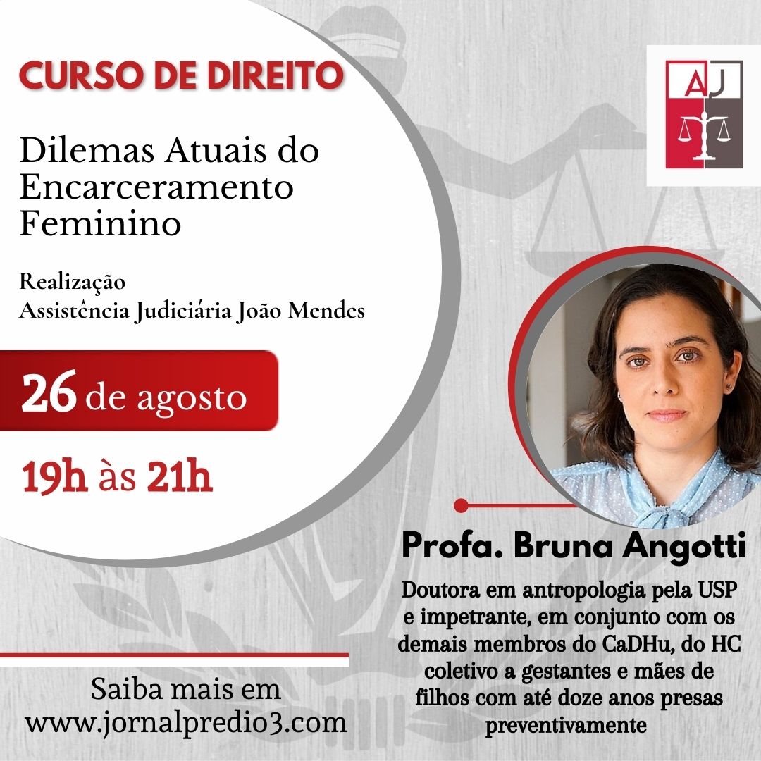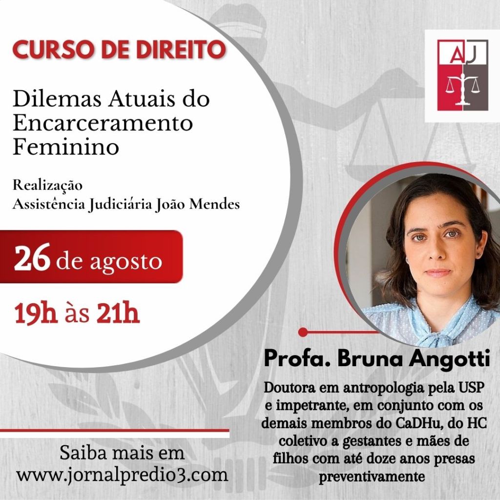 A Assistência Judiciária João Mendes (AJ), órgão de orientação jurídica gratuita à população de baixa renda, dos alunos e antigos alunos da Faculdade de Direito do Mackenzie, em parceria com o Centro Acadêmico João Mendes Jr. e a Alumni Direito Mackenzie, anuncia a realização do Curso “Dilemas atuais do encarceramento feminino”, a ser ministrado pela Professora Bruna Angotti, doutora e mestre em Antropologia Social pela Universidade de São Paulo (2011), especialista em Criminologia pelo Instituto Brasileiro de Ciências Criminais e professora de linguagem jurídica, metodologia da pesquisa jurídica e de antropologia jurídica na graduação de Direito na Universidade Presbiteriana Mackenzie, em São Paulo.