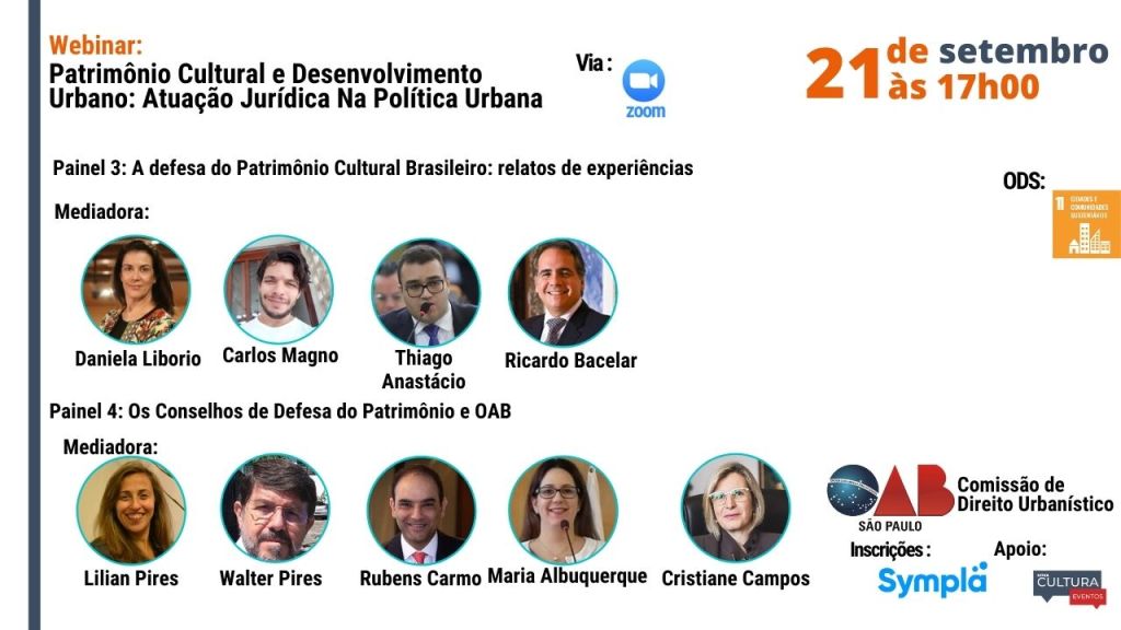 Nos próximos dias 14/09 (segunda) e 21/09 (segunda), a Comissão de Direito Urbano da OAB-SP realiza dois painéis de debate sobre patrimônio cultural e desenvolvimento urbano, por meio da plataforma Zoom, às 17h00. Inscrições podem ser feitas clicando aqui.