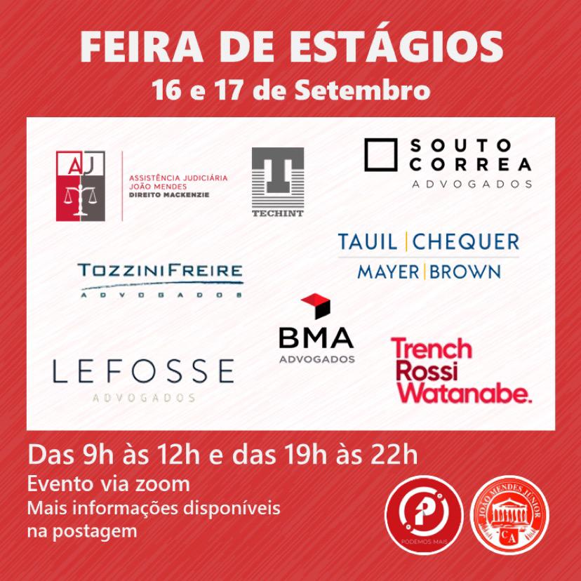 Nos dias 16 e 17 de setembro (quarta e quinta), acontecerá a tão aguardada feira de estágios, promovida pelo Centro Acadêmico João Mendes Junior (CAJMJr)! Nesse evento, contaremos com a participação de diversos escritórios, como Lefosse e Trench Rossi Watanabe, além, é claro, da presença da nossa querida Assistência Judiciária João Mendes (AJJM).