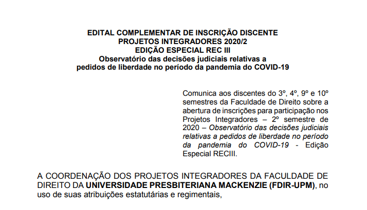 A Coordenação dos Projetos Integradores da Faculdade de Direito da Universidade Presbiteriana Mackenzie comunica a publicação de Edital Complementar de seleção discente para o projeto “Observatório das decisões judiciais relativas a pedidos de liberdade no período da pandemia do COVID-19″, coordenado pelo professor Edson Luz Knippel.