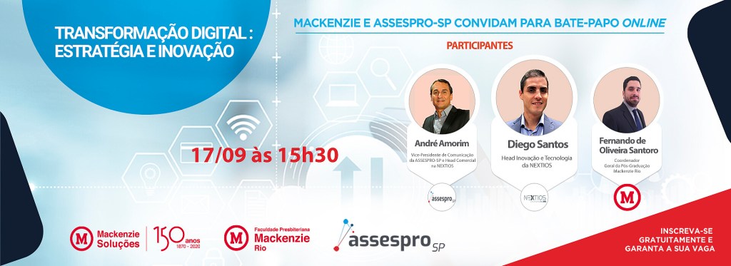 Nesta quinta-feira, 17 de setembro, às 15h30, será realizada a segunda palestra on-line fruto da parceria entre Mackenzie Soluções, área de negócios do Instituto Presbiteriano Mackenzie (IPM), e a Associação das Empresas Brasileiras de Tecnologia da Informação (ASSESPRO-SP), que beneficia a Universidade Presbiteriana Mackenzie (UPM), campi Higienópolis, Alphaville e Campinas; e as Faculdades Presbiterianas Mackenzie Rio e Brasília. O tema desta edição será Transformação Digital: Estratégia e Inovação.