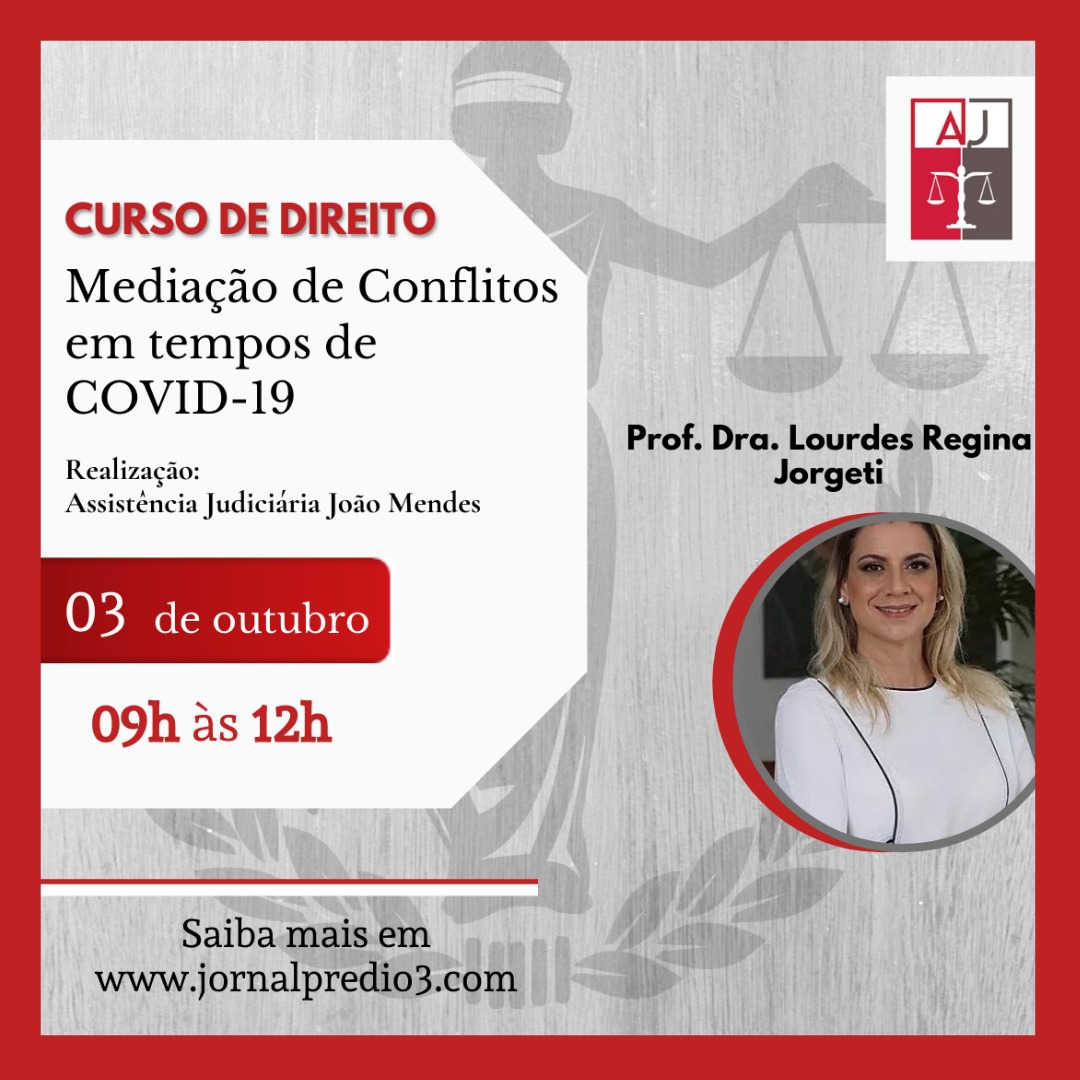 A Assistência Judiciária João Mendes (AJ), órgão de orientação jurídica gratuita à população de baixa renda, dos alunos e antigos alunos da Faculdade de Direito do Mackenzie, anuncia a realização do Curso “Mediação de Conflitos em Tempos de COVID-19”, que será ministrado pela, professora Lourdes Regina Jorgeti de Processo Civil, Prática Jurídica , Conciliação, Mediação e Arbitragem da Faculdade de Direito da Universidade Presbiteriana Mackenzie