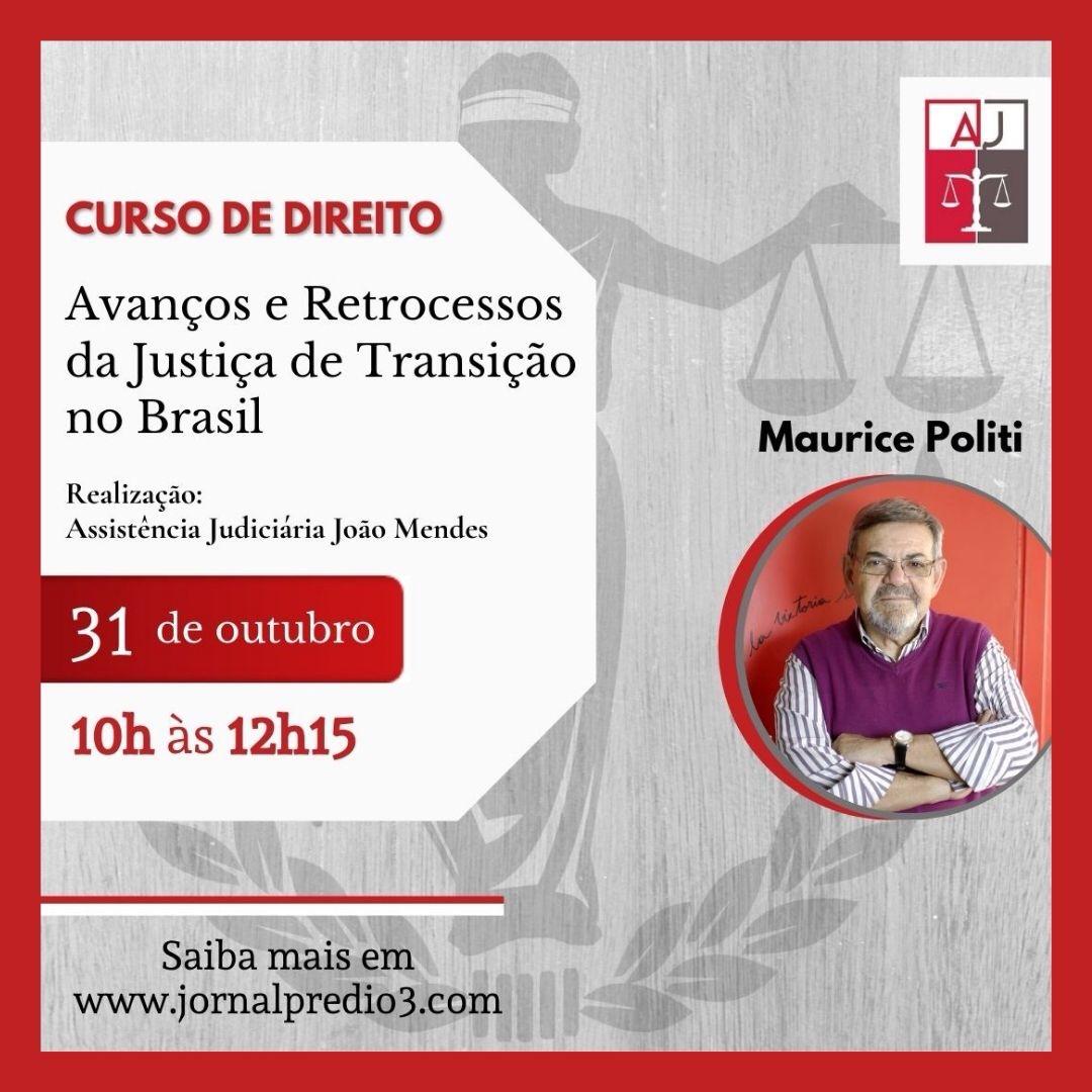 A Assistência Judiciária João Mendes (AJ), órgão de orientação jurídica gratuita à população de baixa renda, dos alunos e antigos alunos da Faculdade de Direito do Mackenzie, anuncia a realização do Curso “Avanços e Retrocessos da Justiça de Transição no Brasil ”, que será ministrado pelo professor Maurice Politi , fundador e atual Diretor da ONG “Núcleo de Preservação da Memória Política”. Foi assessor na Secretaria Especial de Direitos Humanos. Coordenou o Projeto Direito à memória e à verdade. Atuou no Projeto de Lei que criou a Comissão da Verdade. É ex- preso político (1970-1974) da Ditadura Militar.