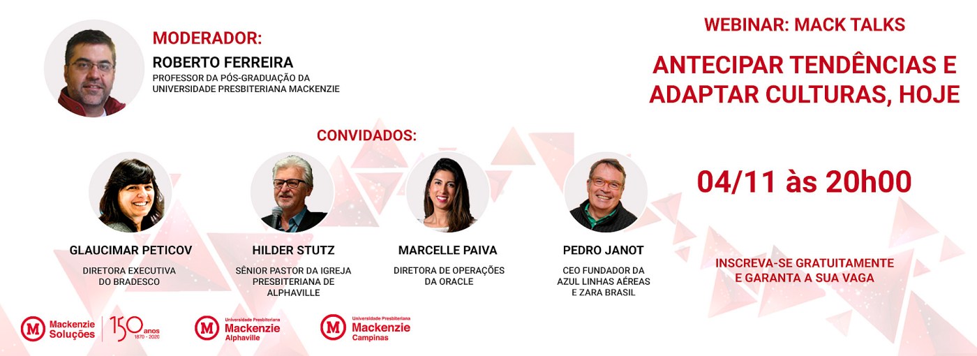 No dia 04 de novembro, será realizado a décima edição do Mack Talks, série de encontros virtuais organizada pelo Mackenzie Soluções, área de negócios do Instituto Presbiteriano Mackenzie (IPM), para debater cenários e tendências do mundo corporativo. Neste novo webinar, o tema discutido será Antecipar Tendências e Adaptar Culturas, Hoje, com foco na análise de cenários futuros, previsão e adaptações necessárias por empresas e corporações, principalmente, em contextos de incertezas. O encontro acontecerá às 20h.