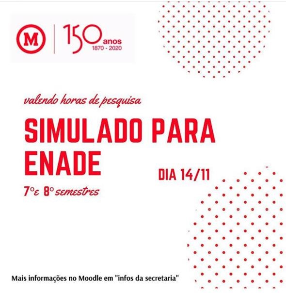 Neste sábado, dia 14 de novembro, ocorrerá um simulado no Mackenzie para o ENADE. O simulado irá acontecer das 7h30 às 11h e tem como foco os alunos do 7º e 8º semestres da Faculdade de Direito.
