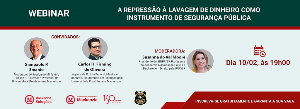 O encontro terá como palestrantes o professor mackenzista Gianpaolo Smanio, atual Procurador de Justiça do Ministério Público de São Paulo, e Carlos Firmino de Oliveira, agente da Polícia Federal e doutorando em Finanças pela UPM. A moderação da conversa será feita por Susanna do Val Moore, presidente do Sindicato dos Policiais Federais no Estado de São Paulo (SINPF/SP) e professora na Academia Nacional de Polícia.