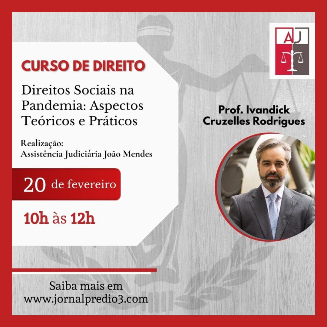 A Assistência Judiciária João Mendes (AJ), órgão de orientação jurídica gratuita à população de baixa renda, dos alunos e antigos alunos da Faculdade de Direito do Mackenzie, anuncia a realização do Curso “Direitos Sociais na Pandemia: aspectos teóricos e práticos ”, que será ministrado pelo professor de Direito Previdenciário da Faculdade de Direito do Mackenzie, Ivandick Cruzelles Rodrigues.