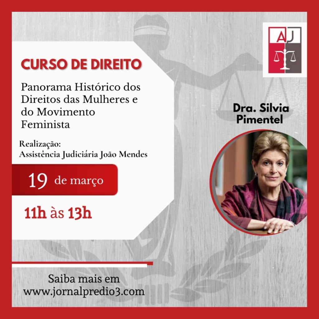 A Assistência Judiciária João Mendes (AJ), órgão de orientação jurídica gratuita à população de baixa renda, dos alunos e antigos alunos da Faculdade de Direito do Mackenzie, em parceria com a Assistência Judiciária 22 de Agosto, anuncia a realização do Curso “Panorama Histórico dos Direitos das Mulheres e do Movimento Feminista”, que será ministrado pela professora Silvia Pimentel.