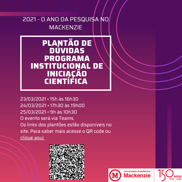 A Coordenadoria de Fomento à Pesquisa (CFP), da Pró-Reitoria de Pesquisa e Pós-Graduação (PRPG) da Universidade Presbiteriana Mackenzie promoverá três encontros virtuais através da plataforma Microsoft Teams nos dias 23, 24 e 25 de março, em horários variados com a finalidade de sanar todas as dúvidas sobre o processo seletivo ou projeto de pesquisa a ser apresentado até o dia 22 de abril, conforme o edital.