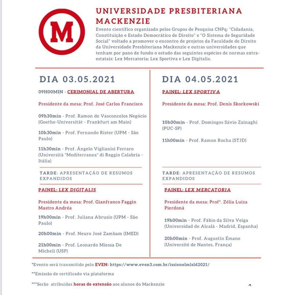 O Grupo de Pesquisa CNPq “Cidadania, Constituição e Estado Democrático de Direito” e “O Sistema de Seguridade Social” estão promovendo o ”I Seminário sobre Internacionalização e Normas Extra-estatais: lex mercatoria, lex sportiva e lex digitalis”, com o objetivo de aproximar projetos desenvolvidos junto à Faculdade de Direito da UPM e de outras universidades.
