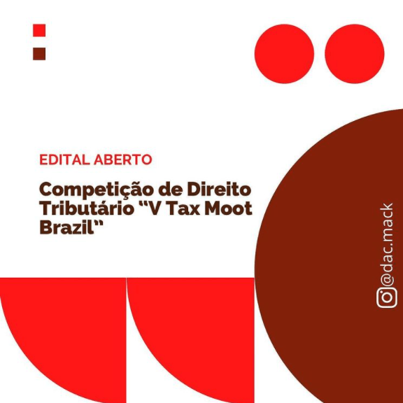 No dia 10 de maio de 2021 foi divulgado, no Moodle, o Edital de Seleção da “V Tax Moot Brazil” da Faculdade de Direito do Mackenzie. A competição concederá ao participantes 50 horas de extensão e 30 horas de pesquisa, com 4 vagas à titulares e 2 vagas de suplentes.