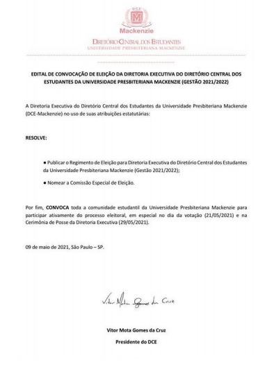 Por fim, CONVOCA toda a comunidade estudantil da Universidade Presbiteriana Mackenzie para participar ativamente do processo eleitoral, em especial no dia da votação (21/05/2021) e na Cerimônia de Posse da Diretoria Executiva (29/05/2021).