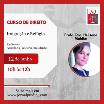 A Assistência Judiciária João Mendes (AJ), órgão de orientação jurídica gratuita à população de baixa renda, dos alunos e antigos alunos da Faculdade de Direito do Mackenzie, anuncia a realização do Curso “Curso Imigração e Refúgio ”, que será ministrado pela professora Dra. Helisane Mahlke de Direito Internacional da Faculdade de Direito do Mackenzie.