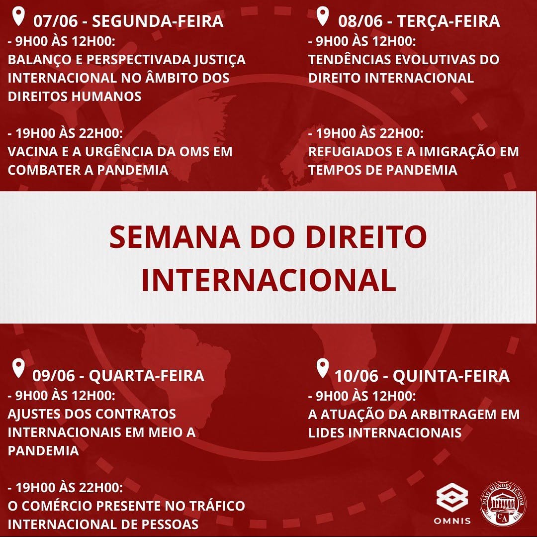 No dia 07/06 (segunda-feira) se iniciará a Semana do Direito Internacional do Centro Académico João Mendes Júnior. Realizada pela primeira vez em 1997, irá ocorrer novamente para discutir temas muito importantes na atualidade.