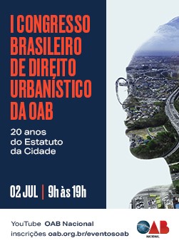 Acontece próximo dia 02/07/2021, das 09h às 19h, o I Congresso Brasileiro de Direito Urbanístico da OAB, organizado pela Comissão Especial de Direito Urbanístico. O evento ocorrerá no formato virtual, em razão da pandemia de Covid 19, e trará os maiores especialistas do tema que farão um balanço dos 20 anos do Estatuto da Cidade.