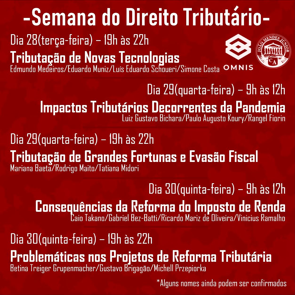 O Centro Acadêmico João Mendes Jr. oferecerá, na próxima semana, do dia 28/09 (terça-feira) ao dia 30/09 (quinta-feira), palestras sobre Direito Tributário.