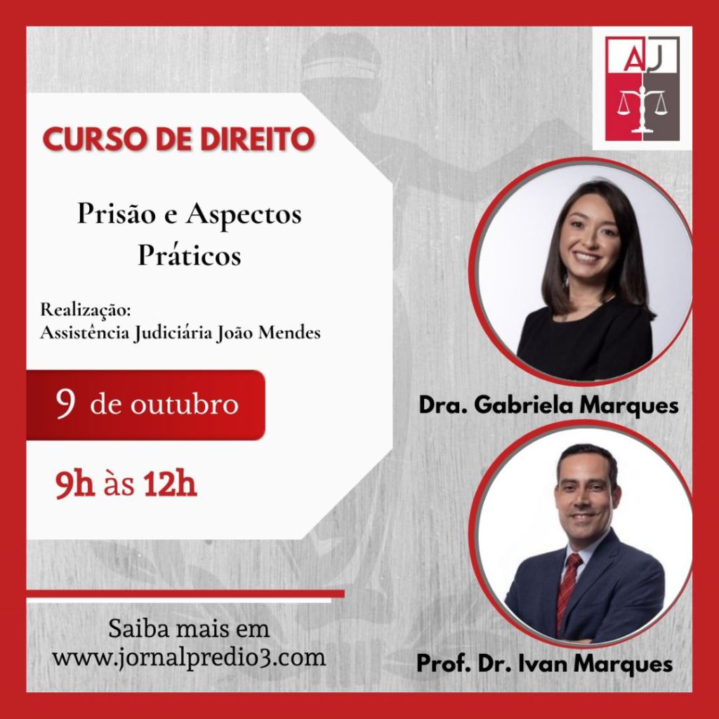 A Assistência Judiciária João Mendes (AJ), órgão de orientação jurídica gratuita à população de baixa renda, dos alunos e antigos alunos da Faculdade de Direito do Mackenzie, anuncia a realização do Curso “Prisão e Aspectos Práticos”, que será ministrado pela Dra. Gabriela Marques, advogada criminalista,e pelo Professor Dr. Ivan Marques de Direito Penal ePrática Penal da Faculdade de Direito da Universidade Presbiteriana Mackenzie.