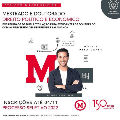 Estão abertas as inscrições para o programa de Mestrado e Doutorado em Direito Político e Econômico Mackenzie. As inscrições devem ser feitas até 04 de novembro. O programa oferece a possibilidade de dupla titulação para os estudantes de doutorado com as universidades de Firenze e Salamanca.