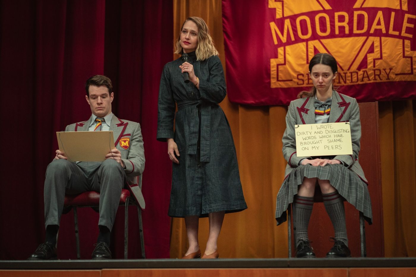 Sex Education, temporada 3, episódio 6. A imagem retrata a cena mais marcante da postura da diretora Hope, que pune três alunos ao posicioná-los no palco do auditório do colégio, frente a todos os outros colegas, carregando placas que descrevem seus erros de maneira humilhante. Além disso, a diretora proibiu os três alunos de se comunicarem com os demais. (Reprodução/Netflix)