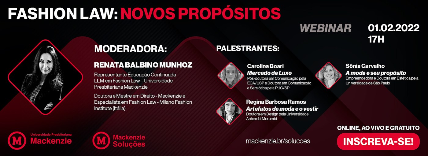 O curso de Fashion Law da Educação Continuada e-LLM da Universidade Presbiteriana Mackenzie (UPM) realizará o webinar Fashion Law: Novos Propósitos. O objetivo do encontro é discutir os novos propósitos do direito da moda diante das circunstâncias trazidas pelo mercado na atualidade. Para se inscrever, basta acessar o link.