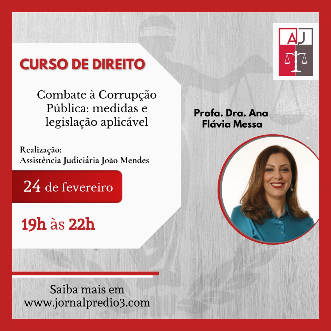 A Assistência Judiciária João Mendes (AJ), órgão de orientação jurídica gratuita à população de baixa renda, dos alunos e antigos alunos da Faculdade de Direito do Mackenzie, anuncia a realização do Curso “Combate à Corrupção Pública: medidas e legislação aplicável”, que será ministrado pela Profa. Dra. Ana Flávia Messa de Direito Constitucional da Faculdade de Direito do Mackenzie. Será abordado no curso: