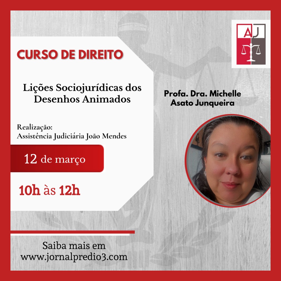 A Assistência Judiciária João Mendes (AJ), órgão de orientação jurídica gratuita à população de baixa renda, dos alunos e antigos alunos da Faculdade de Direito do Mackenzie, anuncia a realização do Curso “Lições Sociojurídicas dos Desenhos Animados ”, que será ministrado pela Profa. Dra. Michelle Asato Junqueira professora do curso de Direito da Universidade Presbiteriana Mackenzie, Coordenadora de Pesquisa da Faculdade de Direito e Coordenadora do Comitê de Ética em Pesquisa envolvendo Seres Humanos. Será abordado no curso exemplos de desenhos animados e sua ligação com o direito.