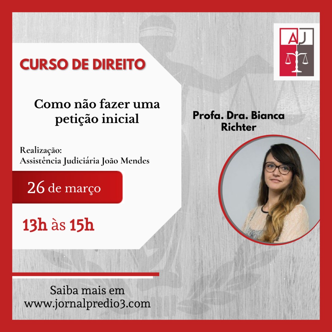 A Assistência Judiciária João Mendes (AJ), órgão de orientação jurídica gratuita à população de baixa renda, dos alunos e antigos alunos da Faculdade de Direito do Mackenzie, anuncia a realização do Curso “Como não fazer uma petição inicial ”, que será ministrado pela Profa. Dra. Bianca Richter de Prática Jurídica na graduação da Faculdade de Direito do Mackenzie.