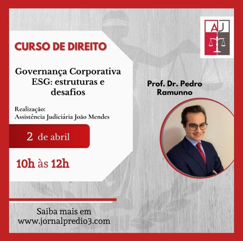 A Assistência Judiciária João Mendes (AJ), órgão de orientação jurídica gratuita à população de baixa renda, dos alunos e antigos alunos da Faculdade de Direito do Mackenzie, anuncia a realização do Curso “Governança Corporativa ESG: estruturas e desafios ”, que será ministrado pelo Prof. Dr. Pedro Ramunno que é Mestre e Doutor em Direito Comercial pela Faculdade de Direito da Universidade de São Paulo.