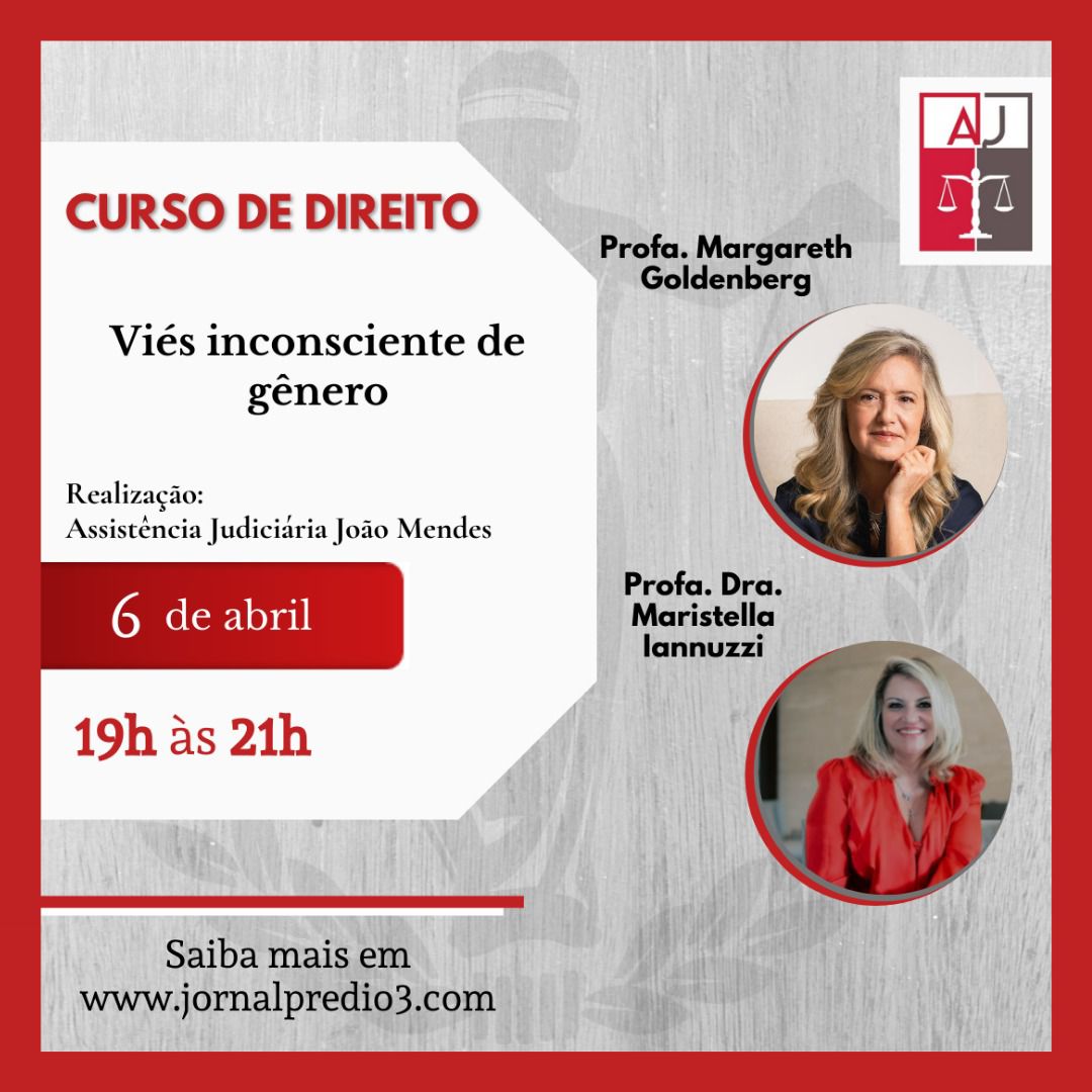 A Assistência Judiciária João Mendes (AJ), órgão de orientação jurídica gratuita à população de baixa renda, dos alunos e antigos alunos da Faculdade de Direito do Mackenzie, anuncia a realização do Curso “Viés Inconsciente de Gênero ”, que será ministrado pela Profa. Margareth Goldenberg, que é psicóloga e psicopedagoga, especialista em direitos humanos & mundo corporativo , há 27 anos, atua nos temas de responsabilidade social , educação, diversidade e equidade de gênero em grandes corporações, e pela Profa. Dra. Maristella Iannuzzi, que é bacharel em Direito e Especialista em Estratégia Digital pela FGV e ESG pelo IBGC, Idealizadora da Plataforma de apoio ao combate à Violência Contra a Mulher – Rota VCM e coordenadora do Programa Mentoria Colaborativa Nós Por Elas.