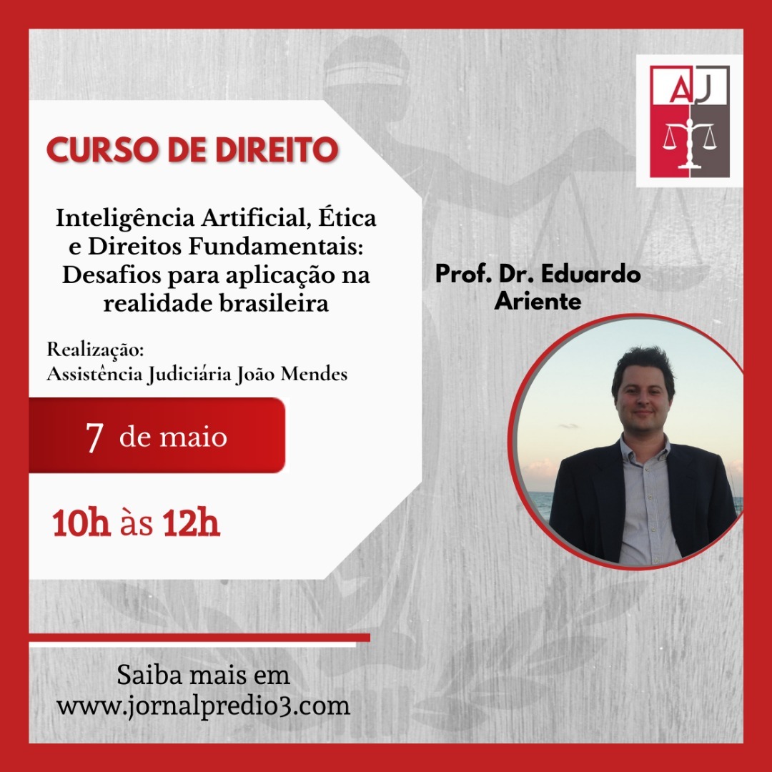 A Assistência Judiciária João Mendes (AJ), órgão de orientação jurídica gratuita à população de baixa renda, dos alunos e antigos alunos da Faculdade de Direito do Mackenzie, anuncia a realização do Curso “Inteligência Artificial, Ética e Direitos Fundamentais: Desafios para aplicação na realidade brasileira ”, que será ministrado pelo Prof. Dr. Eduardo Ariente, Doutor e Mestre em Direito pela USP, Professor da Faculdade de Direito e Coordenador do Núcleo de Inovação Tecnológica (NIT) da Universidade Presbiteriana Mackenzie.