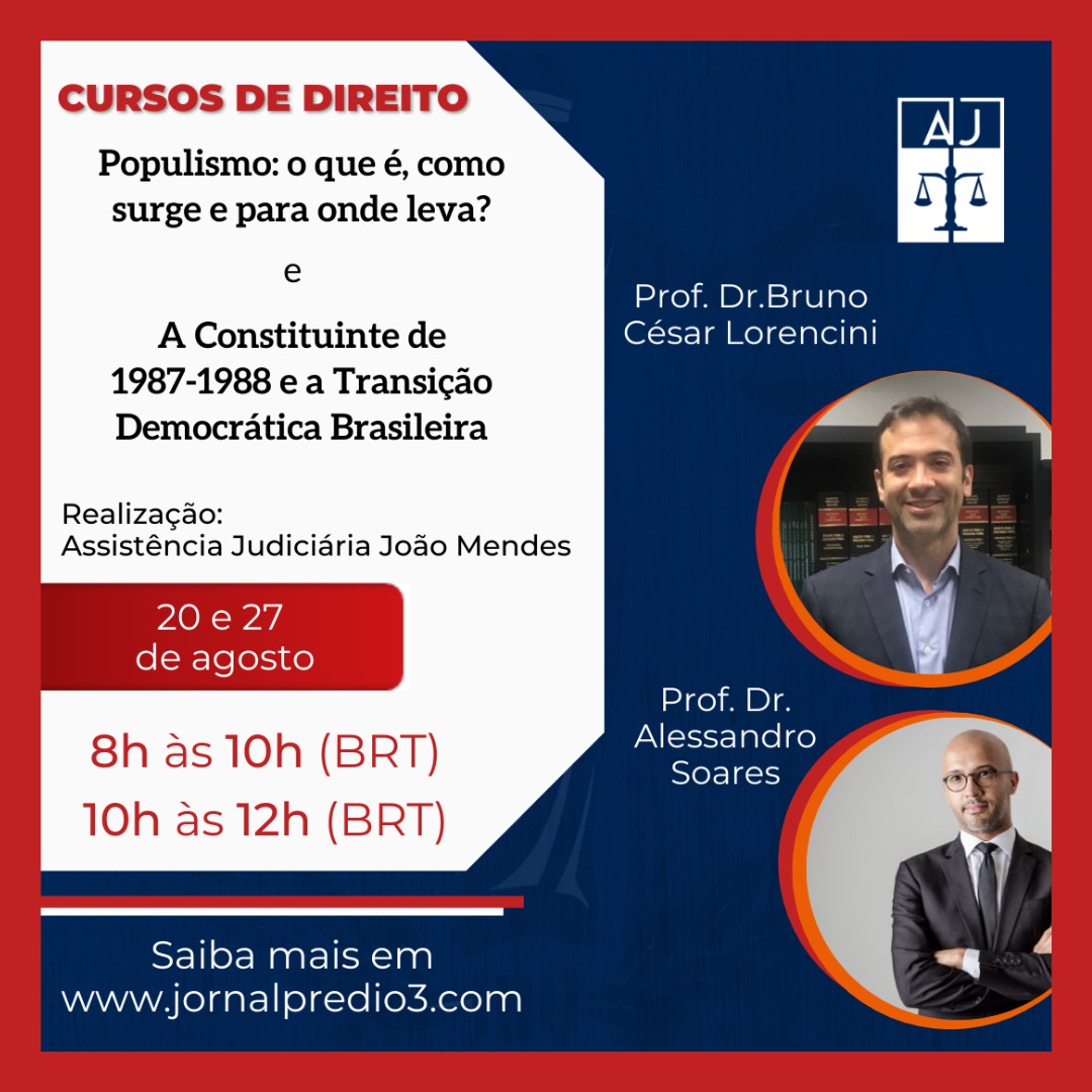 A Assistência Judiciária João Mendes (AJ), órgão de orientação jurídica gratuita à população de baixa renda, dos alunos e antigos alunos da Faculdade de Direito do Mackenzie, anuncia a realização dos Cursos: “Populismo: o que é, como surge e para onde leva?” e “A Constituinte de 1987-1988 e a Transição Democrática Brasileira”, que será ministrado pelo Prof. Dr. Bruno César Lorencini e Prof. Dr. Alessandro Soares, respectivamente.