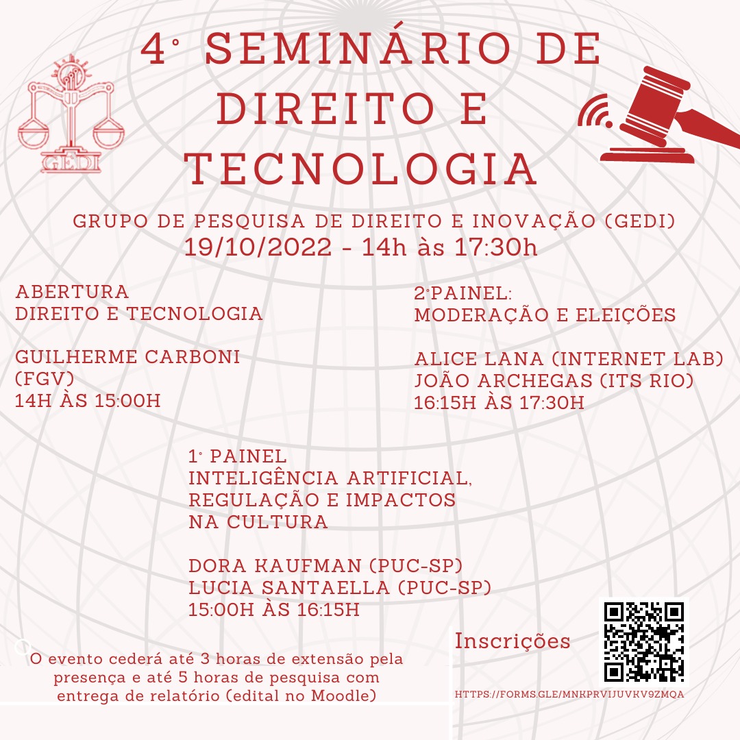 Nesta quarta-feira (19/10/2022) ocorrerá o 4º Seminário de Direito e Tecnologia, realizado pelo Grupo de Pesquisa de Direito e Inovação (GEDI) da Faculdade de Direito. O evento será em formato virtual e terá início às 14:00, com término previsto para 17:30.