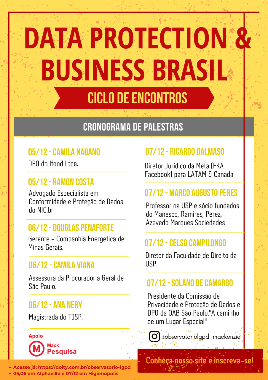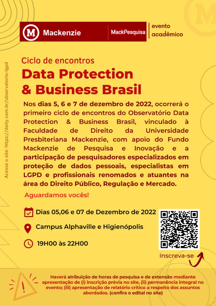 O primeiro ciclo de encontros do Observatório Data Protection & Business Brasil, vinculado à Faculdade de Direito da Universidade Presbiteriana Mackenzie, com apoio do Fundo Mackenzie de Pesquisa e Inovação, ocorrerá nos dias 5, 6 e 7 de dezembro de 2022, no período noturno (19:00 – 22:00), e contará com a participação de pesquisadores especializados em proteção de dados pessoais, especialistas em LGPD e profissionais renomados e atuantes na área do Direito Público, Regulação e Mercado.