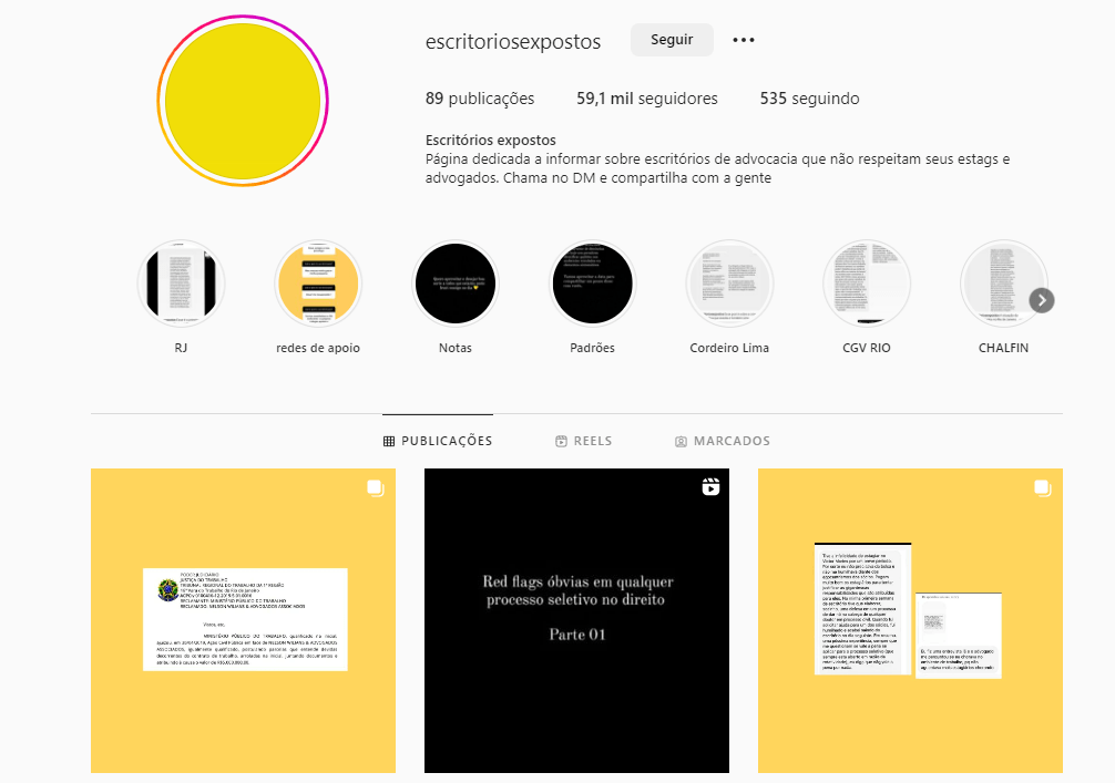 Assim como o Glassdoor, essa página de cunho informal, mas com alta relevância social, possibilita que os estagiários e advogados relatem suas experiências de assédio moral e violações da lei de estágio nos escritórios, alertando os candidatos. É possível identificar os escritórios que lideram o número de denúncias e recebem uma pasta de destaque no topo do perfil.