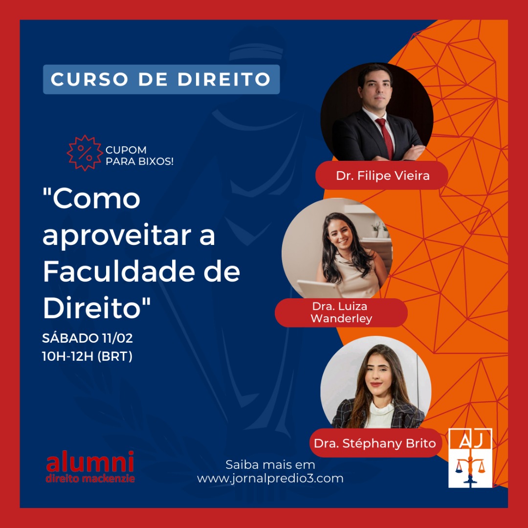 A Assistência Judiciária João Mendes (AJ), órgão de orientação jurídica gratuita à população de baixa renda, dos alunos e antigos alunos da Faculdade de Direito do Mackenzie, anuncia a realização do Curso “Como aproveitar a Faculdade de Direito”, que será ministrado pelo Dr. Filipe da Silva Vieira, pela Dra. Luiza Wanderley e pela Dra. Stéphany Nogueira Brito.