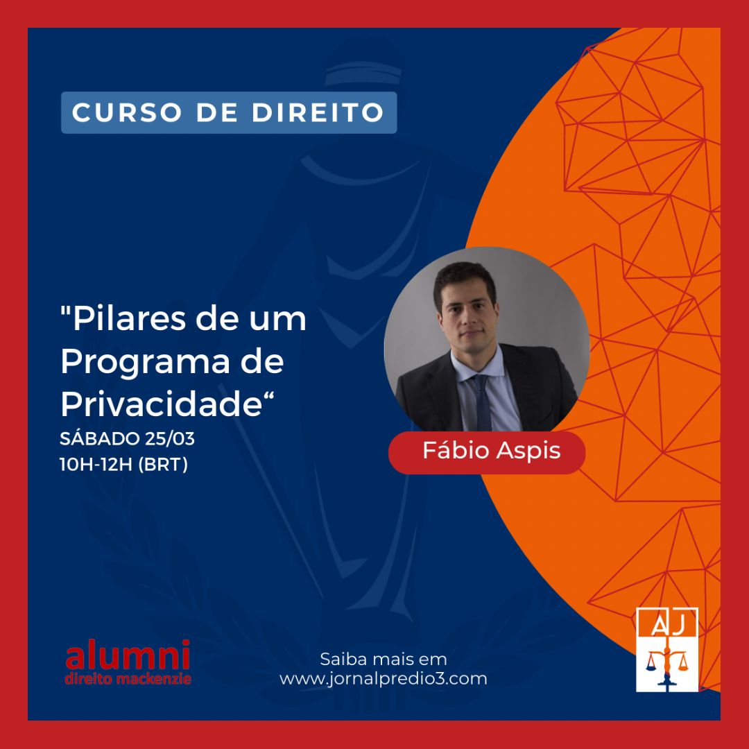 A Assistência Judiciária João Mendes (AJ), órgão de orientação jurídica gratuita à população de baixa renda, dos alunos e antigos alunos da Faculdade de Direito do Mackenzie, anuncia a realização do Curso “Pilares de um Programa de Privacidade”, que será ministrado pelo Dr. Fábio Aspis, Regional Senior Data Privacy Counsel em um Banco Holândes, Cofundador do Juventude Privada e da Law-B, Representante Brasileiro no Digital Law Summer School da Universidade de Genebra (2019), CIPP/E, CIPM, CDPO/BR e FIP pela International Association of Privacy Professionals (IAAP), Data Protection Officer pela Universidade de Maastricht (ECPC/B) e Certificado em Privacy by Desing pela Ryerson University.