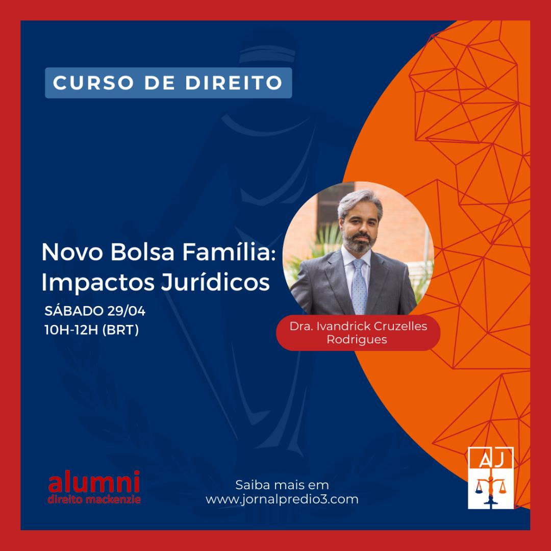 A Assistência Judiciária João Mendes (AJ), órgão de orientação jurídica gratuita à população de baixa renda, dos alunos e antigos alunos da Faculdade de Direito do Mackenzie, anuncia a realização do Curso “Novo Bolsa Família: Impactos Jurídicos”, que será ministrado pelo Dr. Ivandick Cruzelles Rodrigues é Mestrando em Direito Americano e Transnacional pela University of Dayton (OH); Doutor em Direito do Trabalho e da Seguridade Social pela Faculdade de Direito da Universidade de São Paulo (USP); Mestre em Direito Previdenciário pela Pontifícia Universidade Católica de São Paulo (PUC-SP).