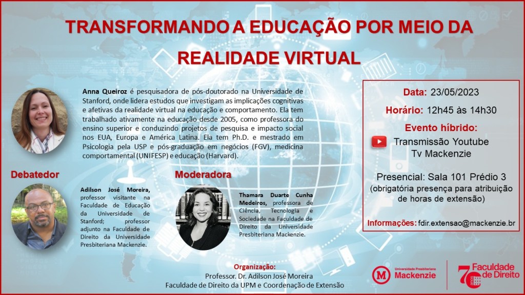 Será transmitido ao vivo pelo canal TV Mackenzie no YouTube e também será aberto ao público presencial, na sala 101 – Prédio 3 (Concedendo horas de extensão para quem acompanhar presencialmente).